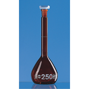 Matraz aforado BLAUBRAND A con certificado de lote color topacio, x 100 ml, Boro 3.3 NS 14/23 tapón en PP. Compra por múltiplo de 2/Precio x un. Brand.
